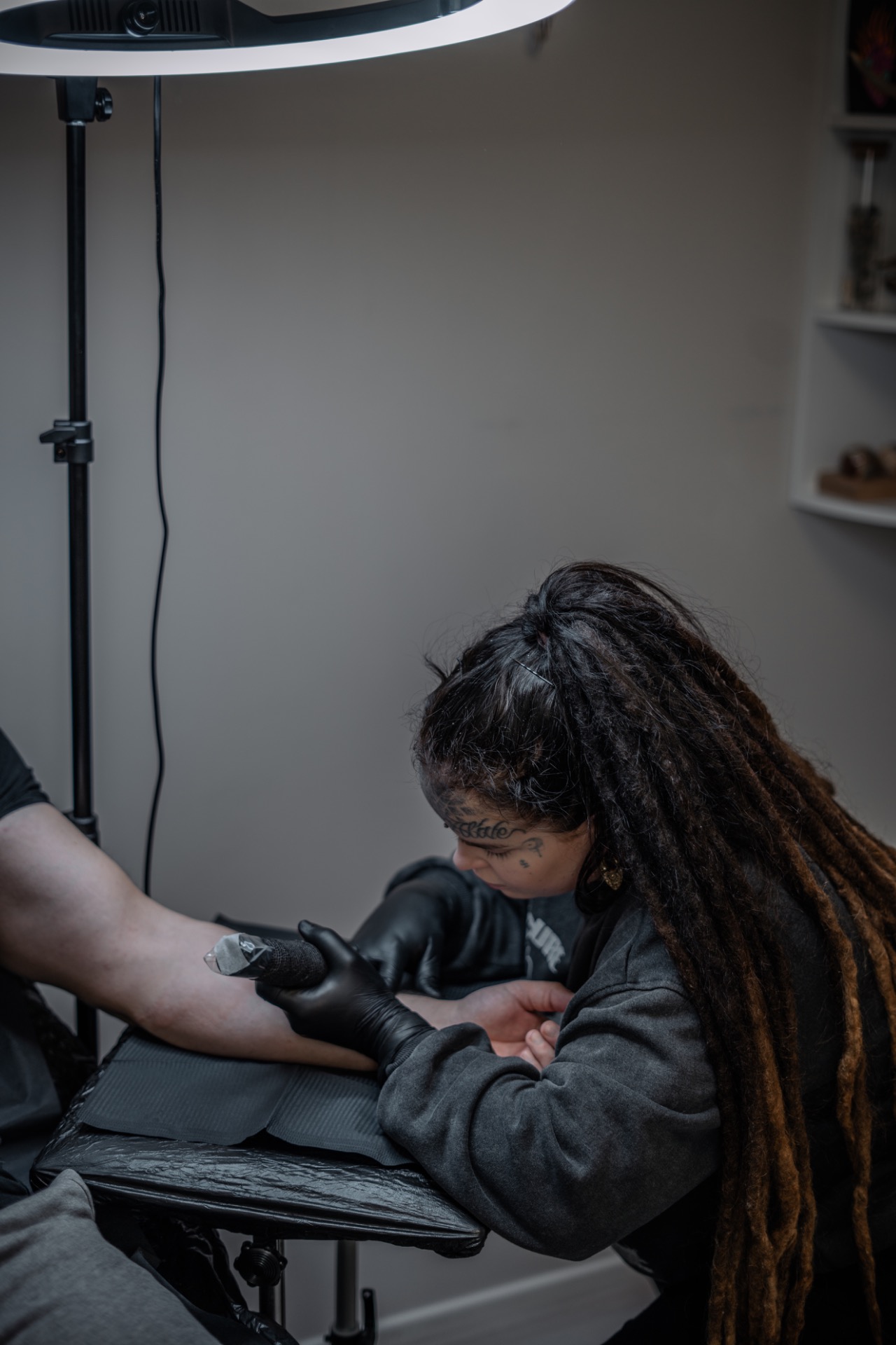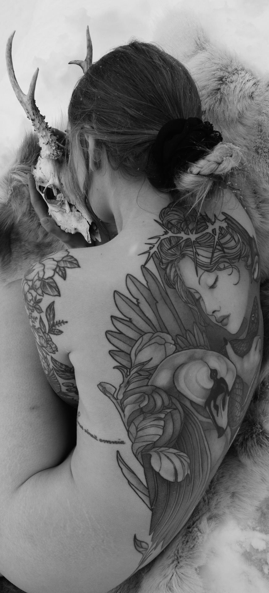 ” Olen Erika, Pyhäjokinen yrittäjä, tatuointiartisti, taiteilija, Äiti, vaimo. Olen lapsesta asti ollut taiteellinen ja koulussa menestyinkin lähinnä kuvataidetunneilla. Piirtäminen erityisesti on ollut aina osa elämääni, rauhoitun vain taiteen ääreen ja se on itselleni tärkein stressinpoistaja liikunnan ohessa. Aloin kiinnostumaan tatuoimisesta yläasteella ja tällöin (valitettavasti) hankin myös omat ensimmäiset tatuointini; henkilö joka nämä teki ei ollut vasta-alkaja mutta oma tyylini on muuttunut huomattavasti kymmenen vuoden aikana. Olen itseoppinut tatuointiartisti. Aloitin 2016-2017 vaiheessa lukemaan tatuointien historiasta ja etsimään tietoa tatuointitekniikoista, anatomiasta ja aseptiikasta.Tähän kuului vuorovaikutus jo alalla olevien kanssa, maailmankuulujen luentojen katselu sekä tietysti keinonahkojen suurkulutus. Nyt kun katson taaksepäin, helpoin tie olisi ollut oppipojan pestissä; en olisi joutunut selvittämään itsekseni kaikkia harjoitteluun kuuluvia vaiheita. Harmittelen sitä että ne muutamat ensimmäiset tatuoinnit olisi voinut jättää tekemättä, tiedän että se kuuluu asiaan mutta mielestäni kaikki tarvitsevat olkapään taakse alussa jonkun joka tietää mitä tehdä. Nykypäivään, eli 9 vuotta alan parissa olleena; Olen tatuoijana varsin kokenut ja ammattitaitoinen, suhtaudun työhöni äärimmäisellä intohimolla ja rakastan sitä mitä teen. Minulle on työssäni tärkeää kehittyä jatkuvasti ja haastaa itseäni tasaisin väliajoin. Omaan vielä lukemattomien tatuointien jälkeen kovan palon oppia jokaiselta kerralta jotakin uutta. Tällä alalla tuntuu että mitä enemmän vuosia on takana niin sitä nöyremmäksi tätä kohtaan tulee (sekä vaativammaksi itseään kohtaan). Arvostan jokaista jotka haluavat taidettani iholleen, se on minulle kunnia-asia. Suhtaudun kaikkiin asiakkaisiini tällä mentaliteetilla. Minulle on tärkeää työssäni toteuttaa tatuointeja jotka ovat sekä asiakkaan että minun mieleeni. Olen oppinut hyvin löytämään kultaisen keskitien oman selkeän tyylini ja asiakkaan kokonaisvaltaisten toiveiden väliltä aina tatuoinnin suunnittelussa. Olen tatuoimisen ohessa tullut äidiksi ja valmistunut myös nuoriso-ja yhteisöohjaajaksi. Tiesin tosin jo ennen valmistumistani että en haluaisi työskennellä kyseisellä alalla johtuen suuresta palosta tähän tatuointihommaan ja näin asia on edelleen. Tällä hetkellä sydäntäni lähellä ovat erityisen isot neotrad(-ish) tatuoinnit (koko selkä, leg-sleeve jne.) sekä ornamentaaliset symmetriset linjatyöt, minua kiehtoo molemmissa tyyleissä niiden monipuolisuus ja se kuinka kauniisti vain pelkillä linjoilla voidaan saada kokonaisuuteen kontrastia.”