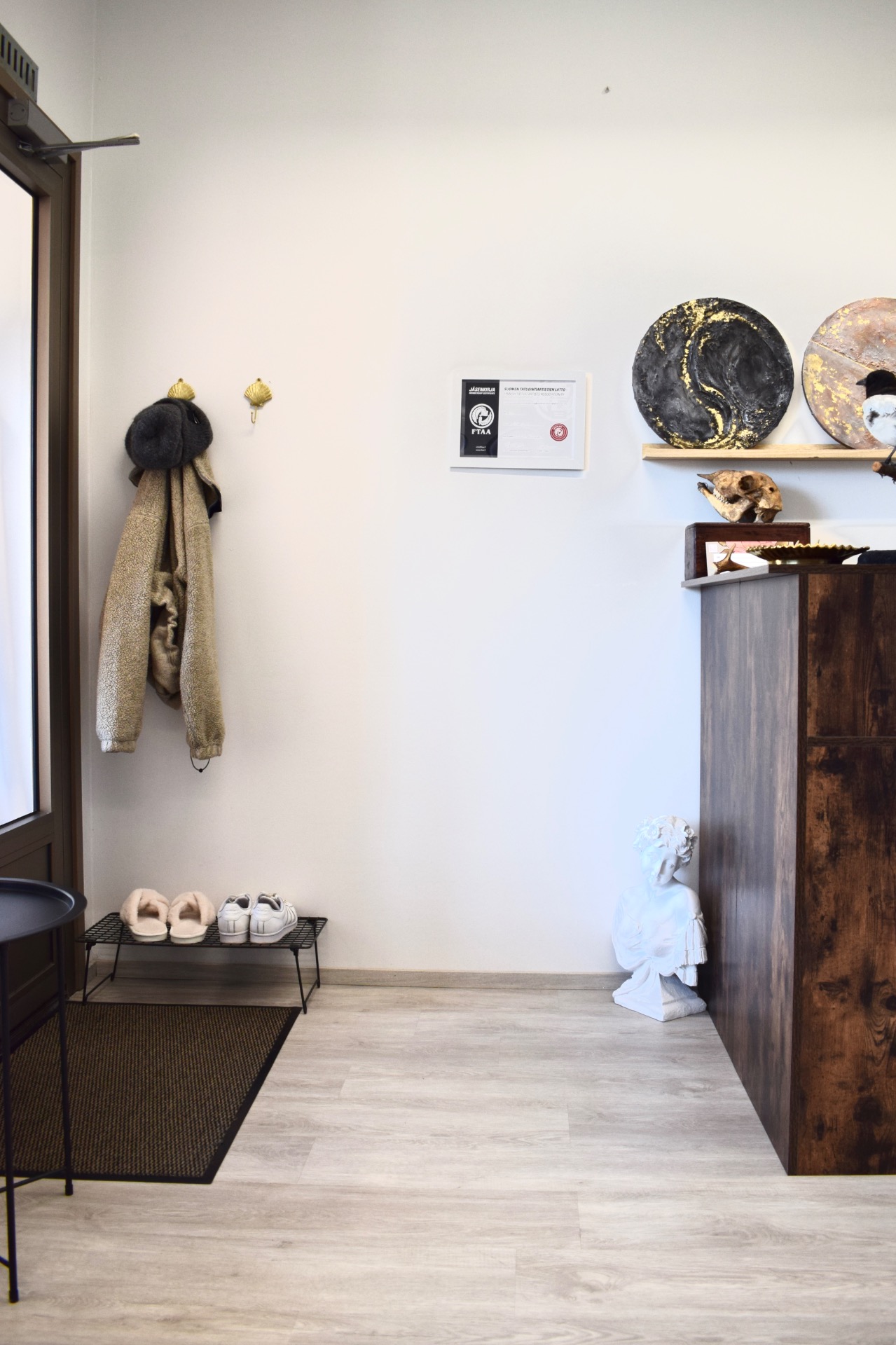 -Kysy aina erikseen jos toiveissa on ottaa ajalle mukaan kaveri, lähtökohtaisesti mm. tatuoijan työrauhan vuoksi on suotavaa että saavut paikalle ilman seuruetta. Studiolla ei myöskään ole varsinaista odotushuonetta tai mahdollisuutta ulkopuolisten oleskella työtilassa tatuoinnin aikana hygienian ja tilojen koon vuoksi.